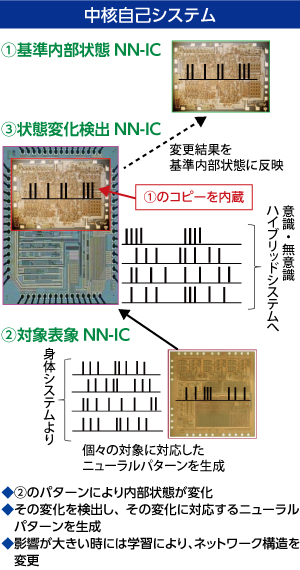 また、身体性や、自己あるいは意識を持つ自律的な脳型コンピュータの実現を目指し、その第一歩として、「脳・身体総合体コンピューティング」の枠組みを提案しました(I-2.)。